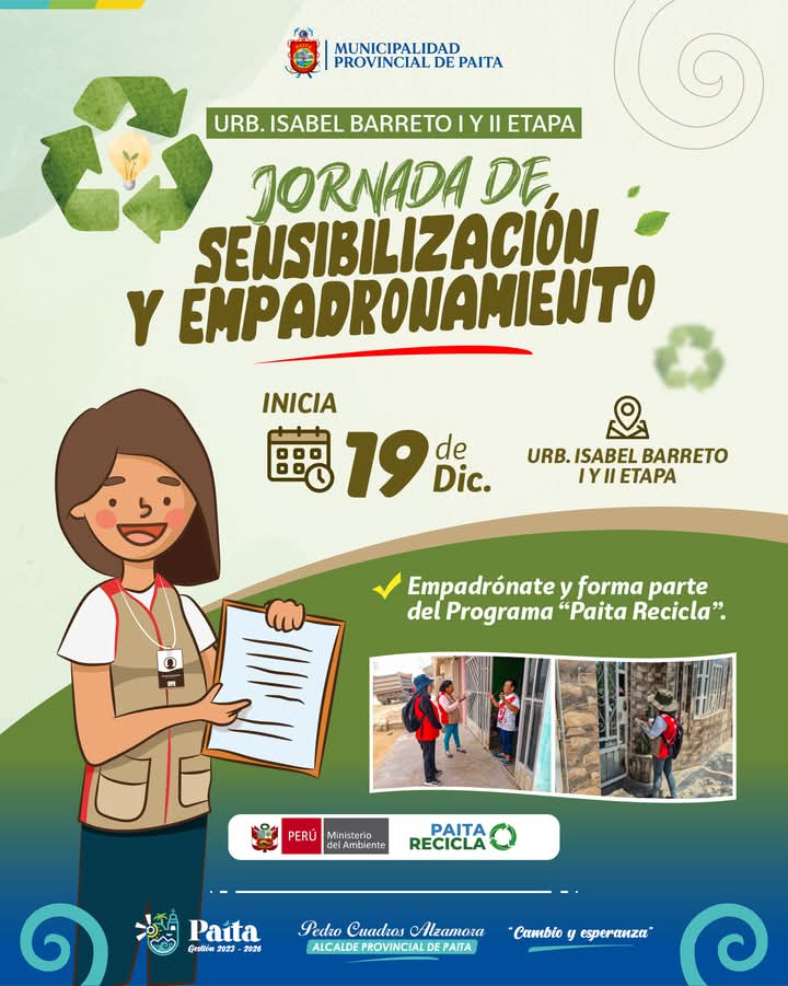 ✅Visitamos tu sector para la sensibilización y empadronamiento en el Programa Paita Recicla.