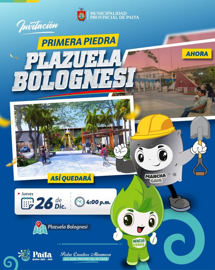 📢Se invita a toda la población Paiteña a la ceremonia de colocación de primera piedra, donde se construirá la tan esperada Plazuela Bolognesi.
