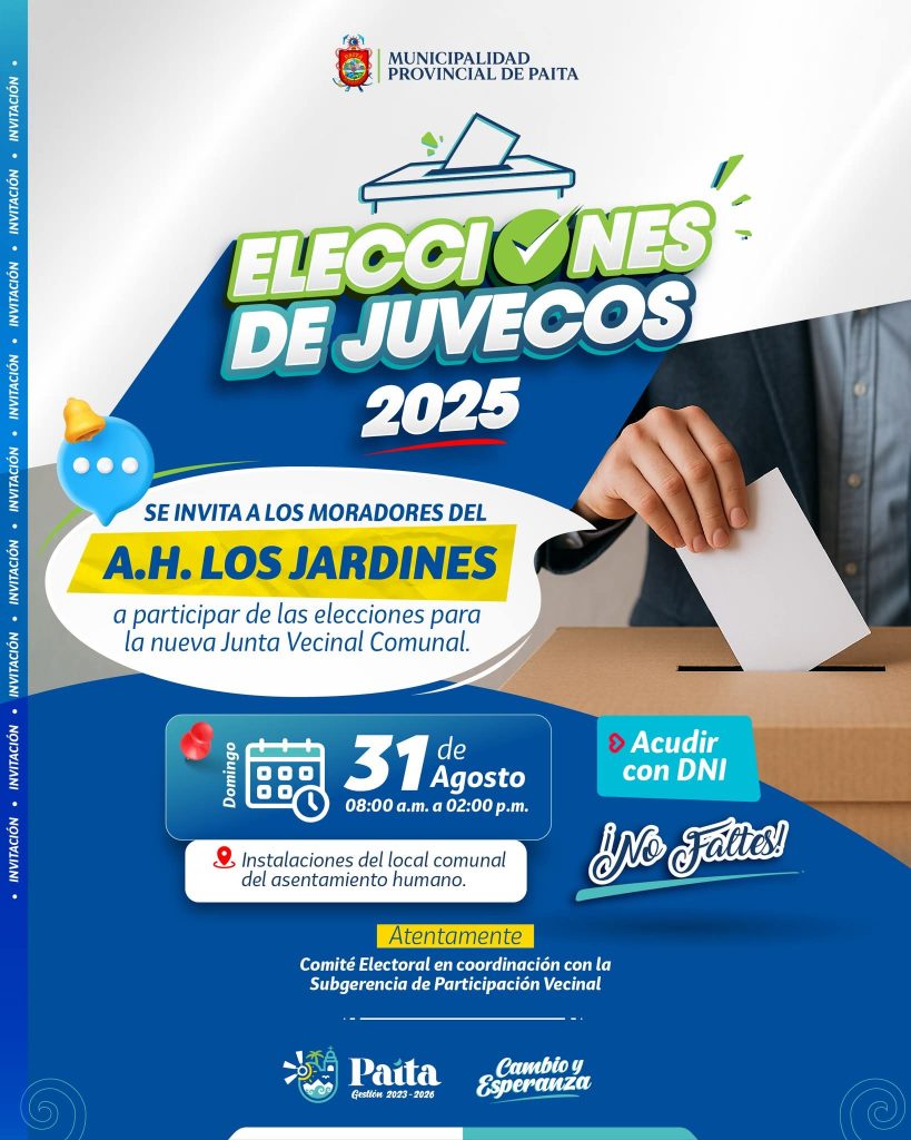 Noticias 馃數AVISO馃搶#Atenci贸n || ELECCI脫N DE LA NUEVA JUNTA VECINAL EN A.H. LOS JARDINES***隆Los esperamos! admin agosto 28, 2025 1 min de lectura Gesti贸n2023_2026 CambioYEsperanza Deja una respuesta Cancelar la respuestaTu direcci贸n de correo electr贸nico no ser谩 publicada. Los campos obligatorios est谩n marcados con *Comentario * Nombre * Correo electr贸nico * Web Guarda mi nombre, correo electr贸nico y web en este navegador para la pr贸xima vez que comente. Historias relacionadas Paita vive una noche hist贸rica馃數馃搶LA VIRGEN DE LAS MERCEDES REGRESA A SU SANTUARIO TRAS M脕S DE UNA D脡CADA隆饾懇饾拪饾拞饾拸饾挆饾拞饾拸饾拪饾拝饾拏 饾拏 饾拕饾拏饾挃饾拏! 1 min de lectura Noticias Paita vive una noche hist贸rica馃數馃搶LA VIRGEN DE LAS MERCEDES REGRESA A SU SANTUARIO TRAS M脕S DE UNA D脡CADA隆饾懇饾拪饾拞饾拸饾挆饾拞饾拸饾拪饾拝饾拏 饾拏 饾拕饾拏饾挃饾拏! septiembre 23, 2025 馃數AVISO馃搶#Atenci贸n || ASAMBLEA GENERAL DE VECINOS EN EL A.H. SAN JOS脡 ***隆Los esperamos!#Gesti贸n2023_2026#CambioYEsperanza Noticias 馃數AVISO馃搶#Atenci贸n || ASAMBLEA GENERAL DE VECINOS EN EL A.H. SAN JOS脡 ***隆Los esperamos!#Gesti贸n2023_2026#CambioYEsperanza septiembre 23, 2025 馃數馃搶PIQUETES SENSIBILIZADORES EN EL MARCO DEL D脥A NACIONAL DE LUCHA CONTRA LA TRATA DE PERSONAS 1 min de lectura Noticias 馃數馃搶PIQUETES SENSIBILIZADORES EN EL MARCO DEL D脥A NACIONAL DE LUCHA CONTRA LA TRATA DE PERSONAS septiembre 18, 2025