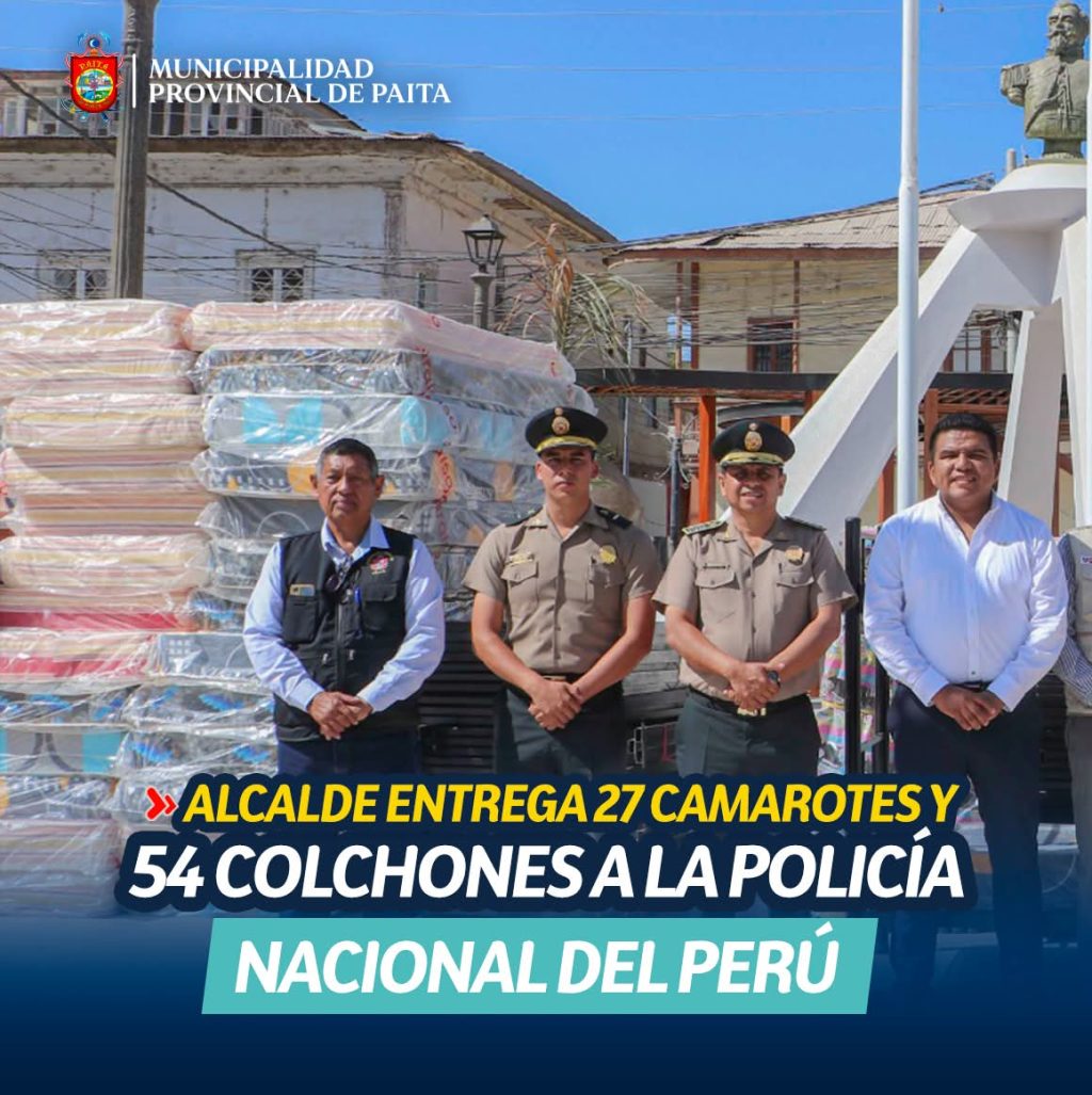 ✅Con el objetivo de mejorar las condiciones laborales del personal policial, el alcalde provincial, Pedro Cuadros Alzamora entregó esta mañana una donación de 27 camarotes y 54 colchones a la Policía Nacional del Perú. Esta ayuda será destinada a las comisarías de Ciudad Roja del Pescador y la Comisaría Sectorial PNP Parte Baja Paita, contribuyendo así al bienestar de los efectivos y fortaleciendo la seguridad en la ciudad.