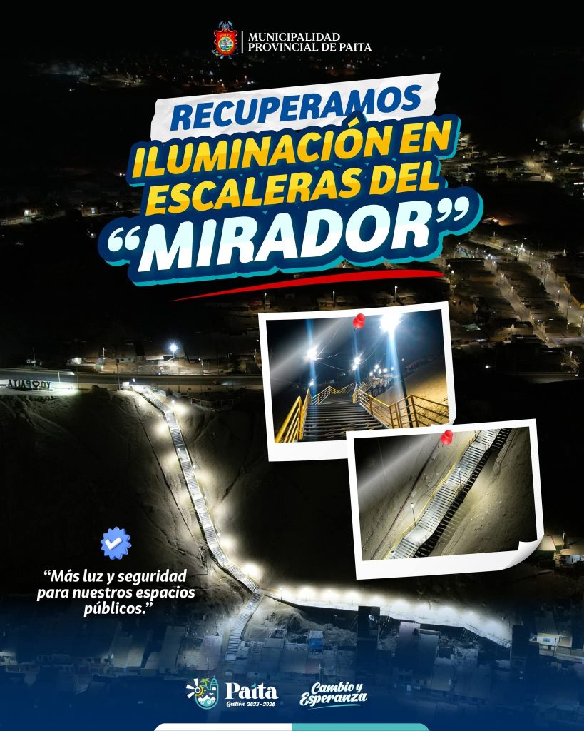 ✅La Municipalidad Provincial de Paita, liderada por el alcalde Pedro Cuadros Alzamora, ha culminado la recuperación del sistema de iluminación en la escalera del Mirador, ubicada en la bajada hacia Paita.