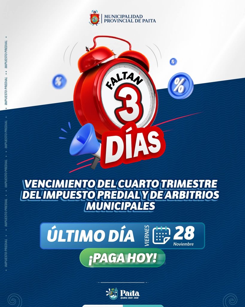 ✅Este 28 de noviembre vence el cuarto trimestre 2025 del Impuesto Predial y Arbitrios Municipales.