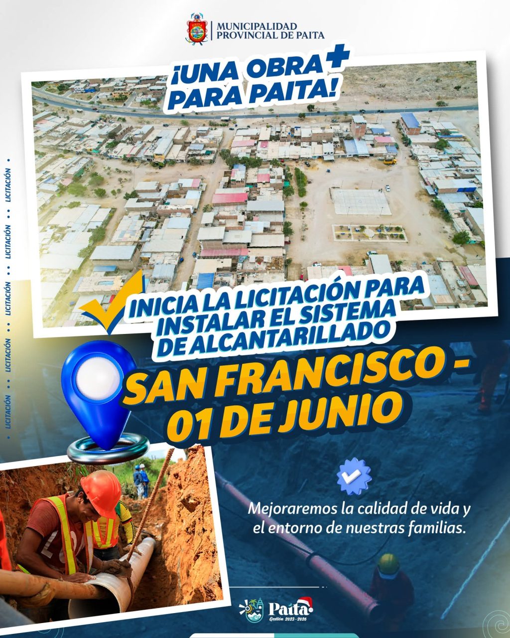 ✅Se ha iniciado la convocatoria de la licitación pública para la instalación del sistema de alcantarillado en el Sector San Francisco – 01 de Junio.