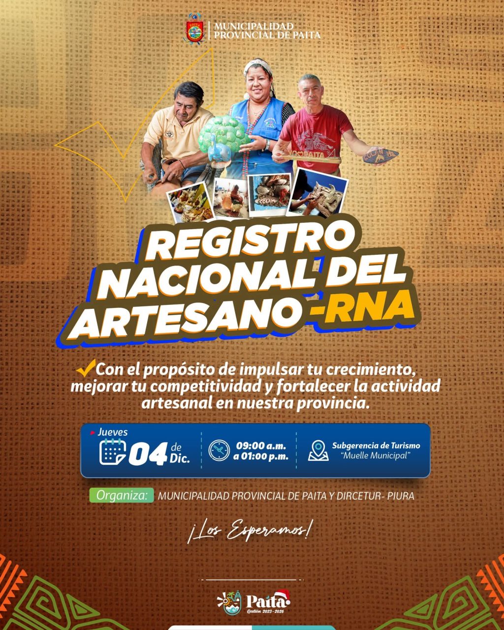 ✔️La Subgerencia de Turismo de la Municipalidad Provincial de Paita invita a inscribirse en el Registro Nacional de Artesanos.